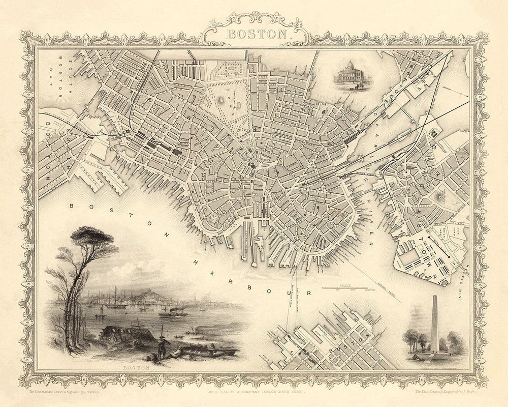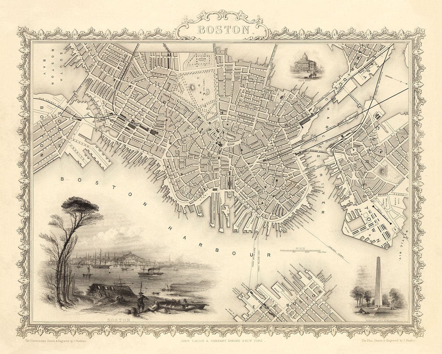 Incisa da John Rapkin e pubblicata da J. Tallis & Co nel 1851, questa è una delle più belle e dettagliate mappe storiche di Boston che puoi trovare dal picco della Gran Bretagna vittoriana industrializzata.