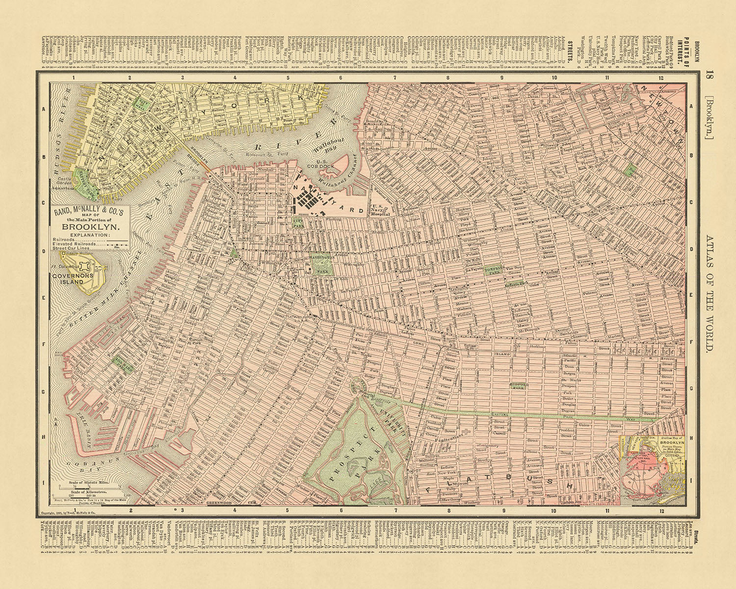 Questa mappa funge da affascinante documento storico, tracciando l'evoluzione della topografia urbana di Brooklyn. I cartografi di Rand McNally hanno dettagliato intricatamente i layout stradali e i punti di riferimento architettonici dell'epoca, presentando un ricco arazzo della vita urbana di Brooklyn all'inizio del secolo. Di particolare interesse è la raffigurazione di Fort Greene Park, allora conosciuto come Washington Park, prima della sua trasformazione da parte dei celebri architetti paesaggisti, Olmsted e Vaux. La mappa demarca anche il confine nord-orientale di Brooklyn con Newtown, una città ex che ora comprende molti quartieri di Queens, inclusa l'attuale Ridgewood.
