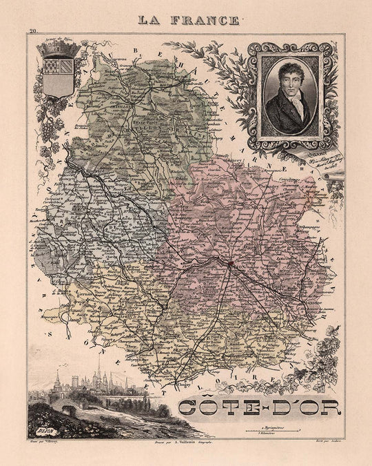 Antica mappa della Côte-d'Or di Vuillemin, 1869: Digione, Beaune, Vigneti, Fiumi, Stemmi