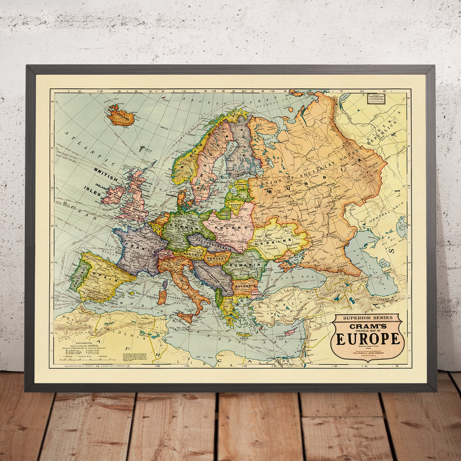 Cram's Political Map of Europe, Superior Series, published in 1925 by George Franklin Cram and The George F. Cram Company of Indianapolis, presents Europe at a moment of intense geographic redefinition with the sure-handed clarity that made Cram a mainstay of American cartography. Conceived for the classroom yet composed with a collector’s eye, it distills a complex continent into a lucid, color-keyed portrait of nations and regions. The map’s confident typography, clean graticule, and elegant cartouches elevate pedagogy into design, while its crisp delineation of borders invites close study of a landscape newly reordered after the Great War. It is a document of knowledge in motion—balanced, bright, and immediately intelligible—capturing the optimism of educational innovation in the early twentieth century.