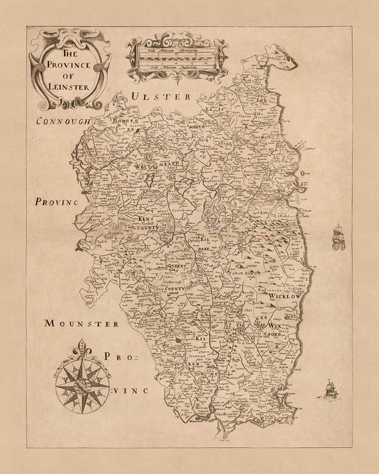 Questa mappa del Leinster, pubblicata originariamente nel 1685 da Sir William Petty, è una mappa politica e fisica dettagliata che fornisce una ricchezza di informazioni sulla regione. La mappa si basa sul Down Survey of Ireland, che è stata la prima mappatura dettagliata della terra su scala nazionale in qualsiasi parte del mondo. L'indagine è stata guidata da Petty, che era un chirurgo generale nell'esercito inglese e una figura prominente nel campo dell'economia politica.