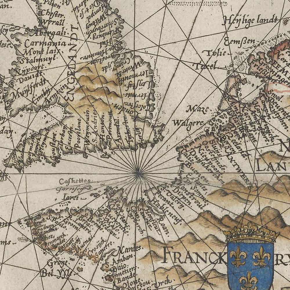 Visually, the sheet is a pageant of late-Renaissance cartography in full sail. Multi-point compass roses bloom across the seas, their petals linked by taut rhumb lines; stylized mountain chains and finely hatched coastlines delineate the lands beyond the tide. Heraldic coats of arms—Spain, Portugal, France, the Netherlands, England, Sweden, Norway—punctuate the political seascape, while bustling galleons and spirited sea monsters animate the waters with the era’s bravado and anxieties. Doetecum’s incisive burin yields crisp lettering and sumptuous ornament, a decorative vocabulary that complements the chart’s instrumental purpose. Rich color heightens the hierarchy of coasts, kingdoms, and currents, making the map at once a working guide and a masterwork of maritime pageantry.