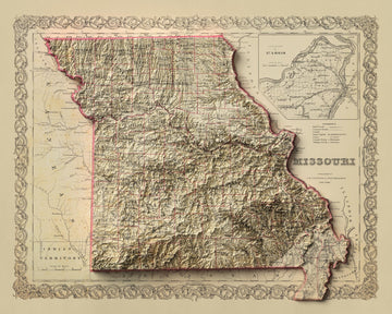 Questa mappa è un tesoro di dettagli storici, che mostra il Missouri di un tempo con i cinque insediamenti più notevoli dell'epoca: St. Louis, Kansas City, Springfield, Independence e Jefferson City. Ognuno di questi luoghi occupa un posto significativo nella storia dello stato, e questa mappa funge da testimonianza del loro lascito duraturo. È un invito a viaggiare indietro nel tempo, per esplorare le radici di questi insediamenti e immaginare come potesse essere la vita nel cuore dell'America durante la metà del XIX secolo.