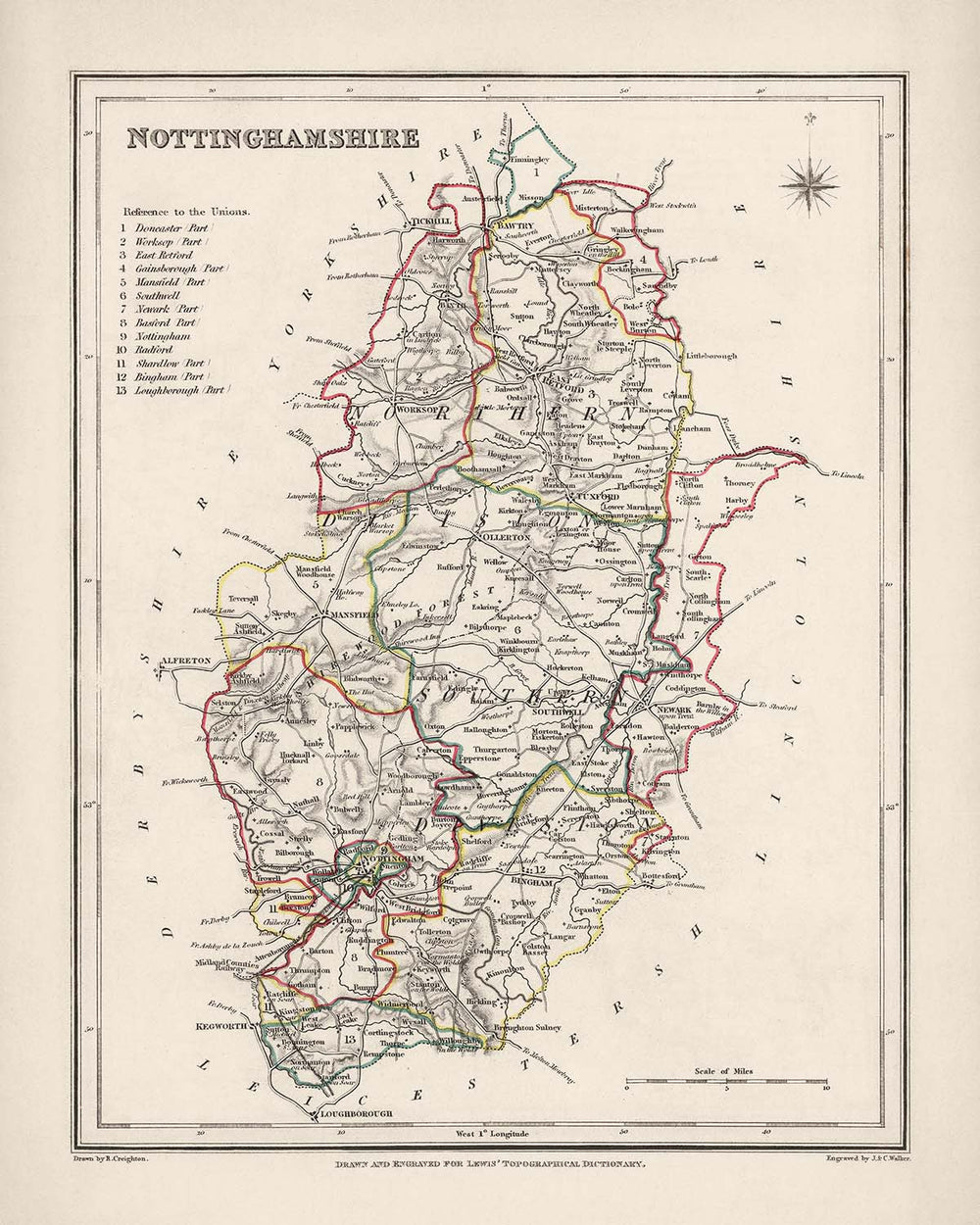 Possedere la Mappa Antica del Nottinghamshire di Samuel Lewis, 1844, ti consente di immergerti nel passato, esplorare la ricca storia della regione e apprezzare i dettagli intricati di questa mappa splendidamente realizzata. È un tesoro per gli appassionati di storia, gli amanti della cartografia e chiunque cerchi un pezzo unico del patrimonio del Nottinghamshire.