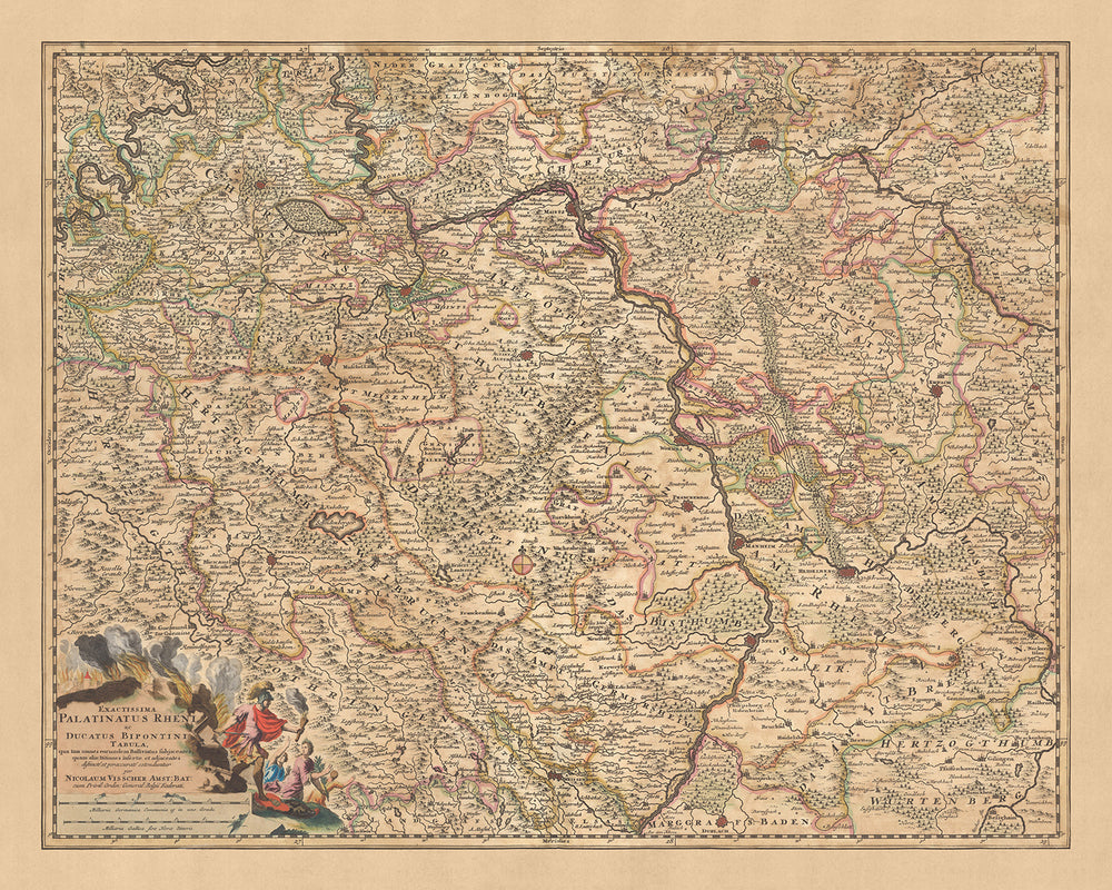 Mappa antica del Palatinato del Reno e del Ducato di Zweibrücken, Visscher, 1690: Francoforte, Mannheim, Saarbrücken, Magonza, Darmstadt