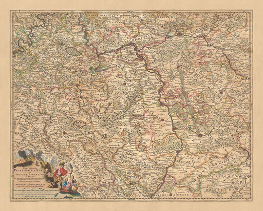 La mappa presenta in modo prominente cinque città significative dell'epoca: Francoforte, Mannheim, Saarbrücken, Magonza e Darmstadt. Ogni città è rappresentata in modo intricato, offrendo un'idea della loro importanza storica. Francoforte, una città chiave del commercio internazionale, è splendidamente illustrata, così come Mannheim, un bastione del Palatinato. Saarbrücken, Magonza e Darmstadt sono anche rappresentate con attenzione, evidenziando i loro ruoli nel complesso paesaggio politico dell'epoca.