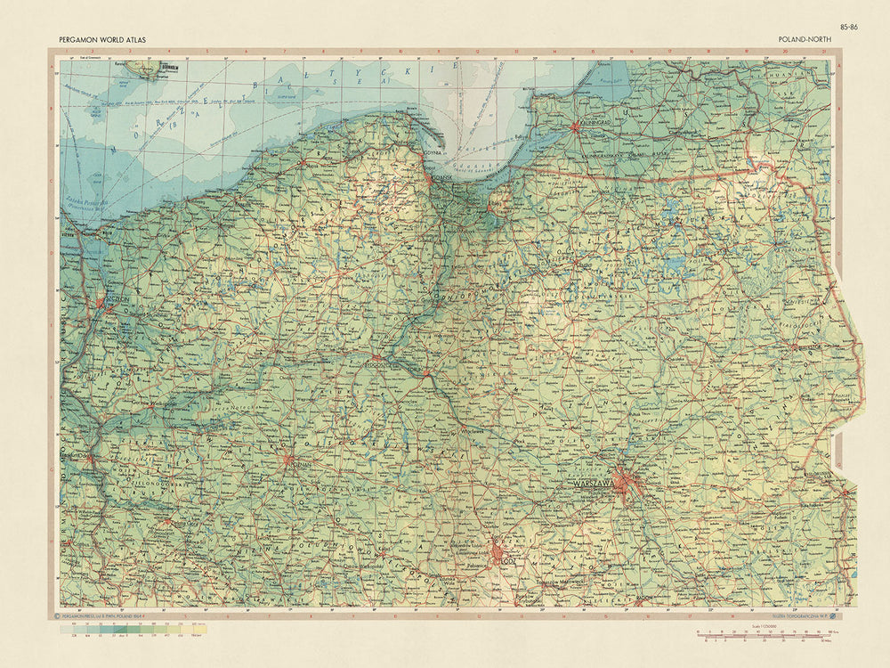 Polonia Nord, pubblicata nel 1967 dal Servizio Topografico dell'Esercito Polacco, è una mappa politica e fisica dettagliata della metà settentrionale della Polonia e di Kaliningrad. La mappa fornisce una ricchezza di informazioni sulla regione, inclusa la sua topografia, idrografia, confini politici e principali città e paesi.