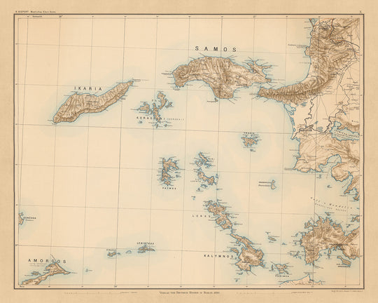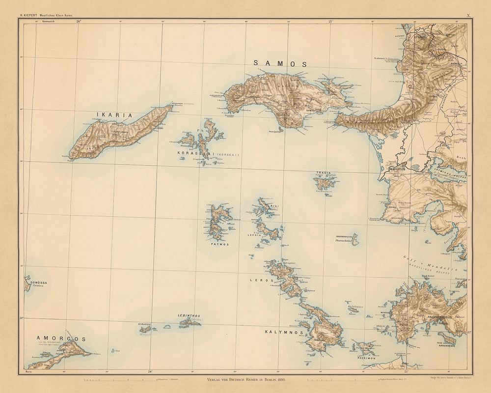 Antica mappa di Samo e delle isole Egee di Kiepert, 1890: Icaria, Calimno, Fournoi, Efeso