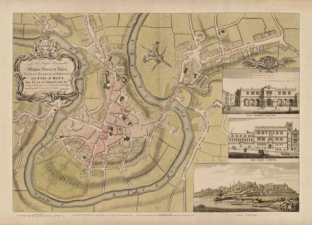 Durante il XVIII secolo, Shrewsbury era una importante città di mercato e aveva una posizione strategica vicino al confine tra Galles e Inghilterra. Era il luogo dove le diligenze in viaggio da Londra a Holyhead si fermavano spesso (il porto di Holyhead era dove si poteva prendere una nave per l'Irlanda). Come puoi vedere sulla mappa, la città si trova tra il Welsh Bridge a Ovest e l'English Bridge a Est (noto come Stone Bridge).