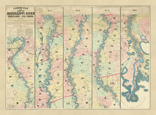Questa meravigliosa vecchia mappa del fiume Mississippi è stata pubblicata originariamente nel 1863. È stata creata da JT Lloyd.
