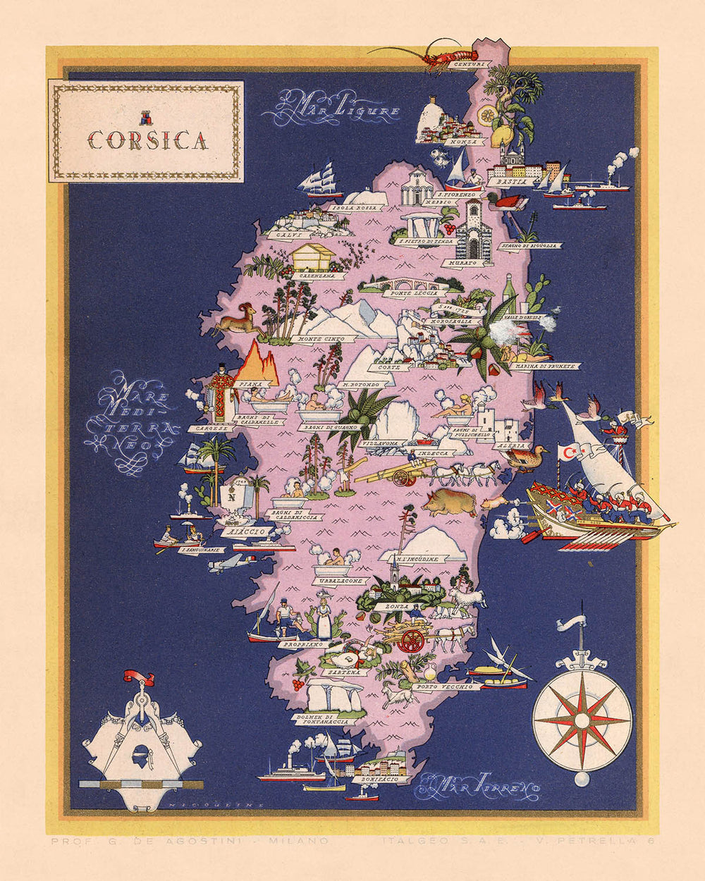 Questa mappa dell'Italian Region of Corsica, pubblicata originariamente nel 1938 dalla compagnia cartografica italiana Giovanni De Agostini, è un esempio bellissimo e dettagliato di una mappa tematica e pittorica. La mappa si concentra sulla Regione Italiana della Corsica, situata nel Mar Mediterraneo, e fornisce una ricchezza di informazioni sulla geografia, la storia e la cultura della regione.