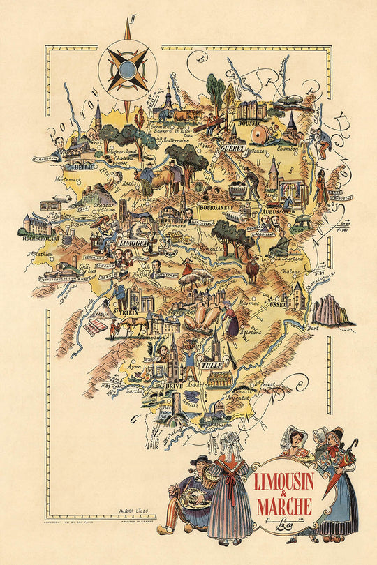 Mappa Pittorica Antica del Limousin e del Marche di Liozu, 1951: Limoges, Brive-la-Gaillarde, Tulle, Oradour-sur-Glane, Château de Val