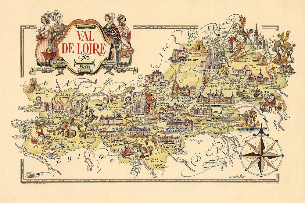 Antica mappa pittorica della Valle della Loira di Liozu, 1951: Orléans, Tours, Angers, Castelli, Vigneti, Vino