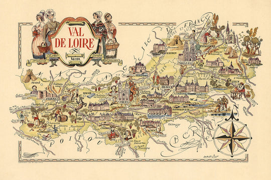 I paesi e le città della Valle della Loira, tra cui Orléans, Tours, Angers e Blois, sono illustrati con meticolosità, ognuno con il suo fascino unico e significato storico. La mappa cattura anche le attività agricole della regione, le scene di mercato e i mestieri tradizionali, offrendo uno sguardo nella vita quotidiana dei suoi abitanti. Questa fusione di elementi storici e culturali rende la mappa non solo una guida geografica, ma anche un documento storico che racconta la storia della Valle della Loira.