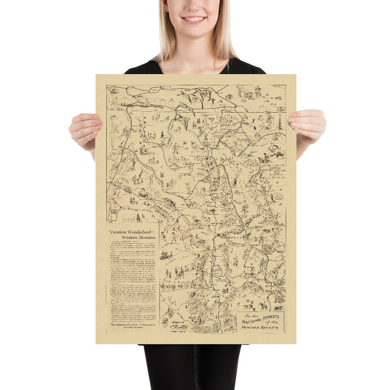 Old Pictorial Map of Montana Rockies National Forests by LaCasse, 1940: Glacier NP, Missoula, Butte, Flathead Lk, Lolo