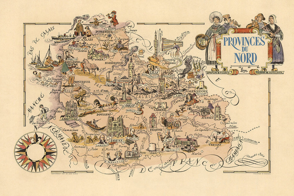Mappa Pittorica Antica del Nord-Pas-de-Calais di Liozu, 1951: Lille, Dunkerque, Valenciennes, Douai, Cambrai