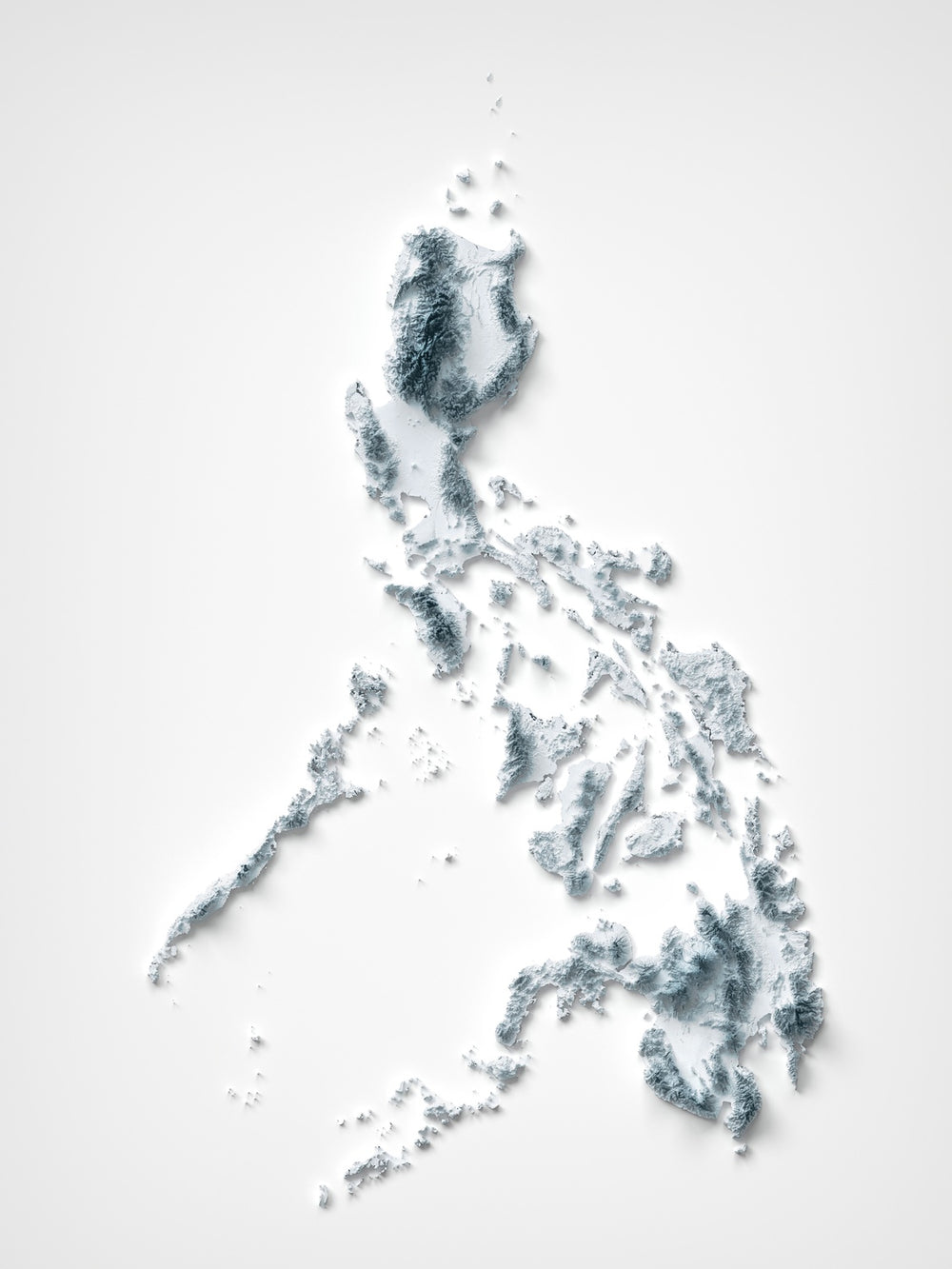 This is a minimalist topographical relief map of the Philippines, created by The Unique Maps Co. and enhanced with our trademarked Unique 3D process. There are no labels, no roads, and no towns — just the islands themselves, sculpted by light and shadow so you can read peaks, ridges, valleys, and wide river plains at a glance. Long raking highlights pick out mountain spines; soft, even shading reveals the lowlands and broad alluvial flats; sharp, conical silhouettes betray the country’s famous volcanoes.