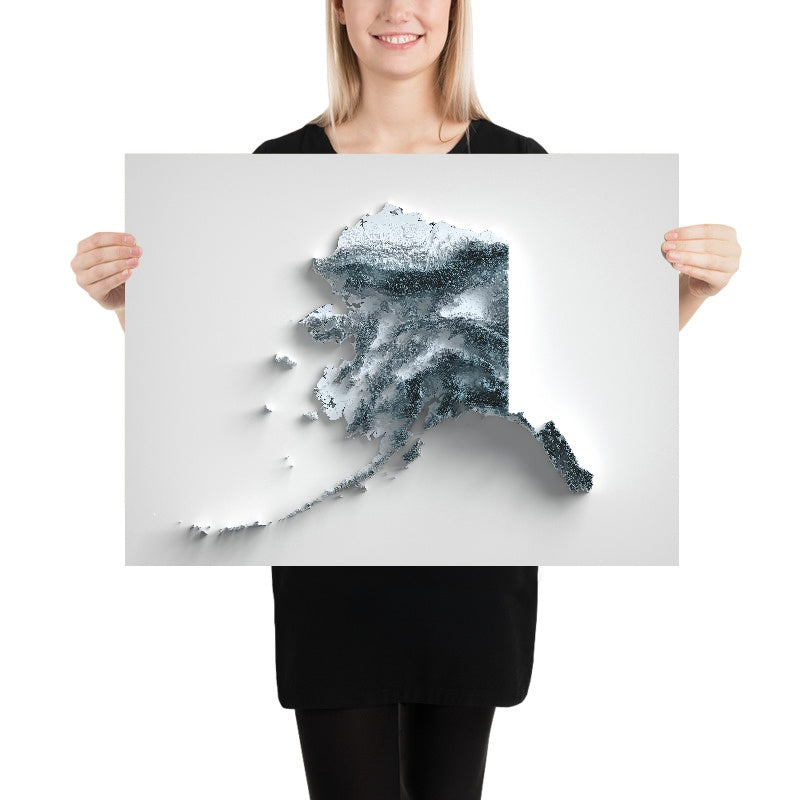Seen in this way, Alaska’s enormity becomes legible: a state of towering ranges and tide-carved coasts, of glacier-chiseled valleys and far-reaching rivers, of plateaus, uplands, and plains that knit the extremes together. Whether you live beneath these peaks, have traced these fjords by ferry, or are gifting a keepsake of an unforgettable journey, this relief map distills the state’s wild complexity into a piece that rewards close, lingering study — every shift of light revealing a new ridge, a new valley, a new story in the land.