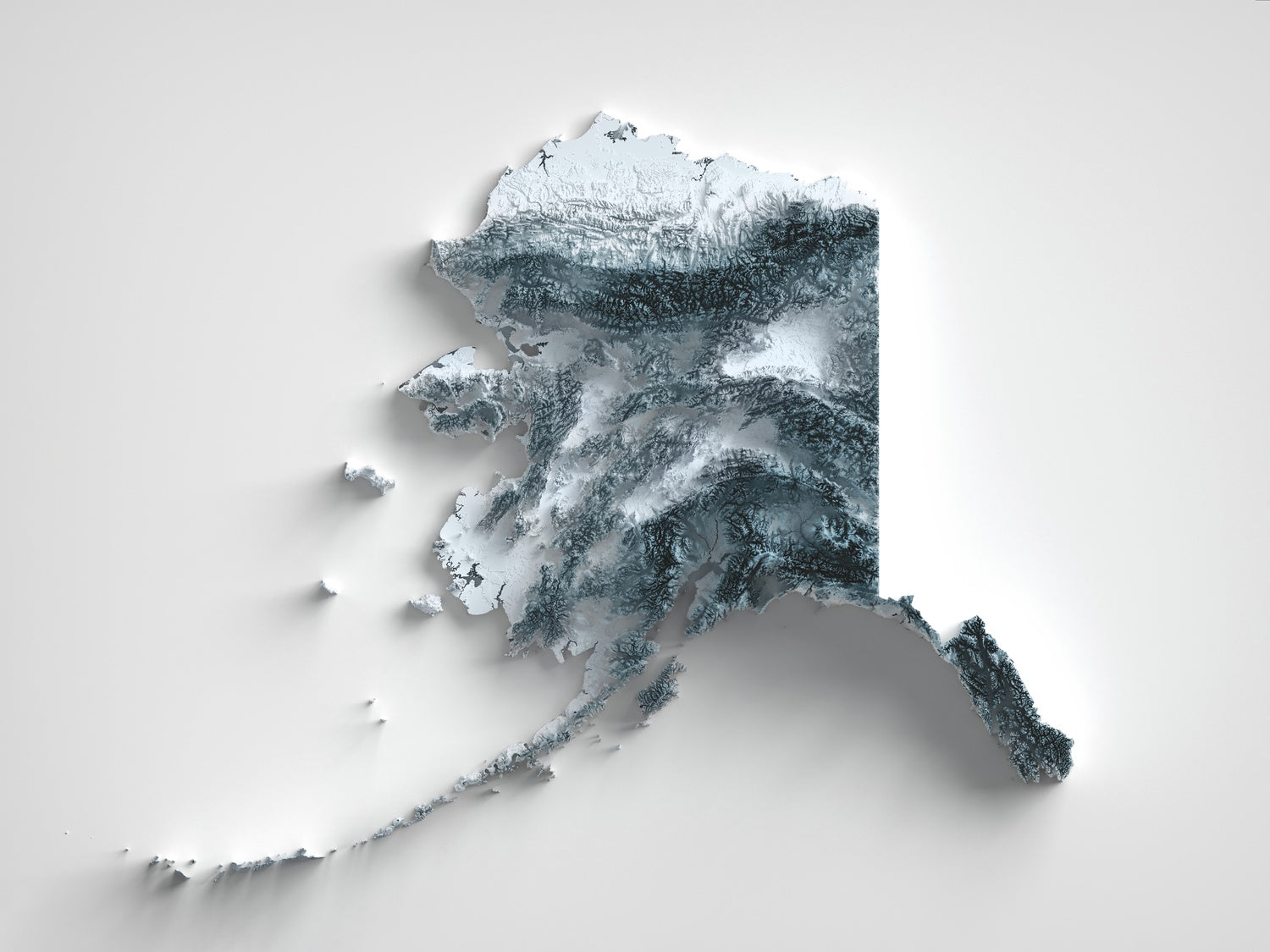 This is a minimalist topographical relief map of Alaska, created by The Unique Maps Co. and enhanced with our trademarked Unique 3D process. There are no labels, no roads, and no towns — only the sculpted forms of the land itself. Carefully modeled light and shadow sweep across the surface to pick out razor-edged ridgelines, deep glacial troughs, and the broad, quieter expanses of lowland plains.