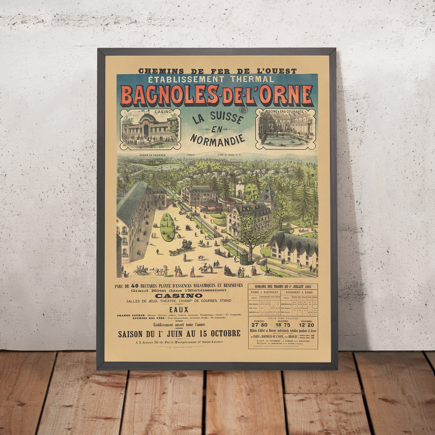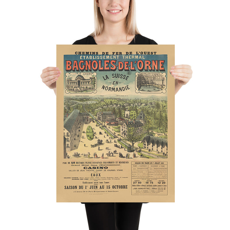 Bagnoles-de-l’Orne, nestled in the Orne department of Normandy, rose to fame in the 1800s as a therapeutic retreat. The town’s thermal establishment drew fashionable visitors for rest cures and promenades, accessible via the Chemins de Fer de l’Ouest—one of the great arteries that connected Paris to the coasts and countryside. The poster’s proud strapline “La Suisse en Normandie” neatly sums up the appeal: alpine freshness without leaving northern France, complete with lakeside leisure, pine-scented forests, and Belle Époque comforts.