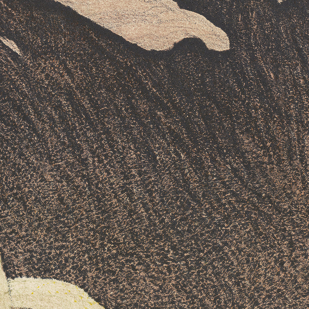 Visually, Cardinaux balances angular mountain silhouettes against sweeping, curved glacial forms, creating a dynamic tension between hard and soft shapes. The dominant beige and brown tones evoke sunlit rock and snow under a warm sky, while passages of black anchor the composition—most notably in the typography and the crisp shadowing that lends the peaks their sculptural presence. Subtle stippling and cross-hatched textures build depth without clutter, and occasional muted greens suggest alpine meadows far below. The result is both graphic and tactile: a timeless, minimalist statement that sits beautifully in neutral interiors, from Scandinavian modern to rustic chalet style.
