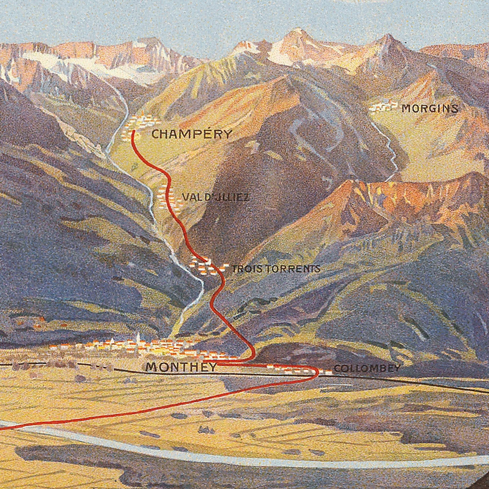 The subject of this poster is historically significant: the Aigle–Ollon–Monthey connections and the Monthey–Champéry route opened the Chablais to a new generation of travelers. Reckziegel’s design celebrates that shift, pairing crisp typography and route naming with a lyrical view that conveys both the practicality of rail travel and the promise of alpine escape. It is a visual emblem of the era when a rail ticket could carry you from the plains into the high country in a single, exhilarating day.