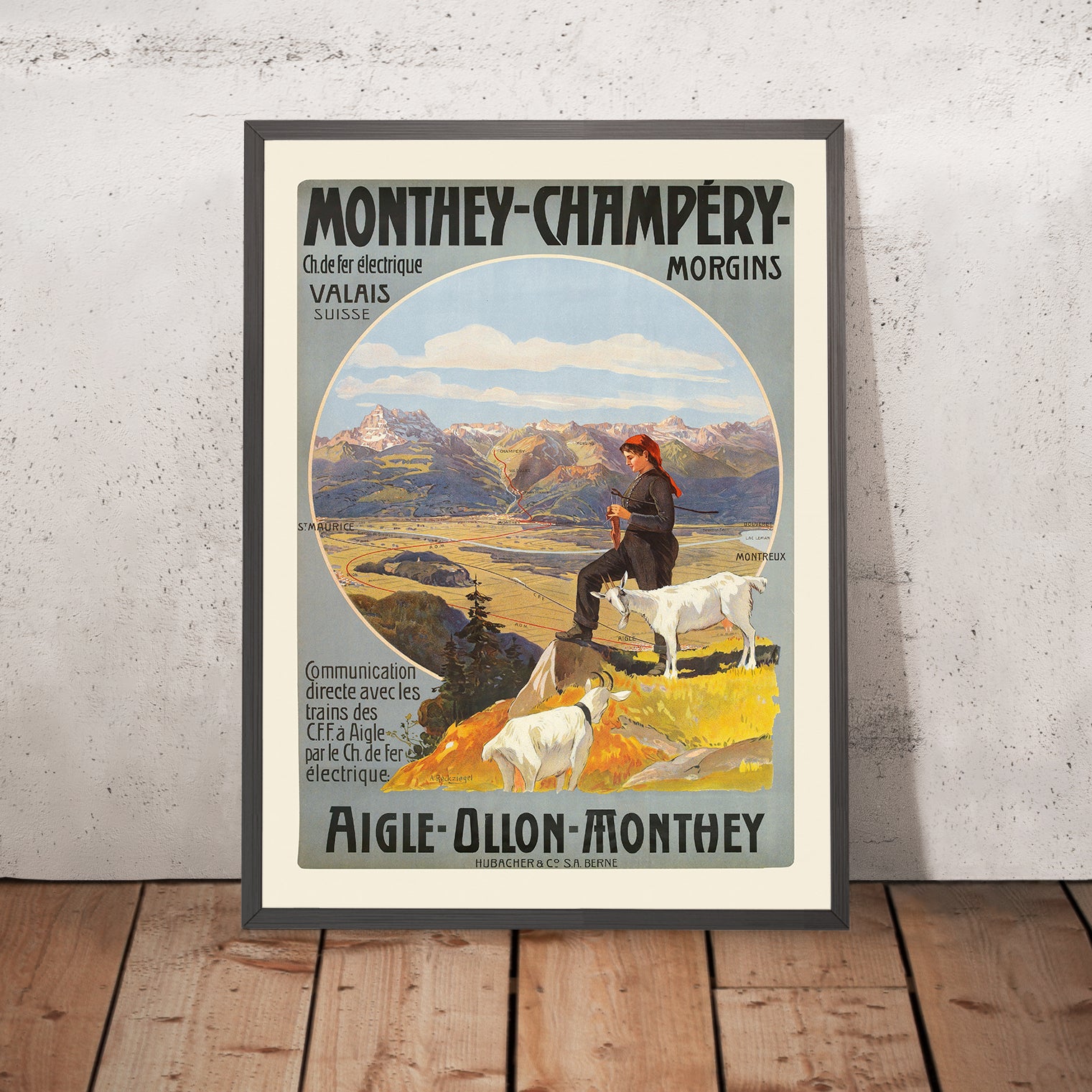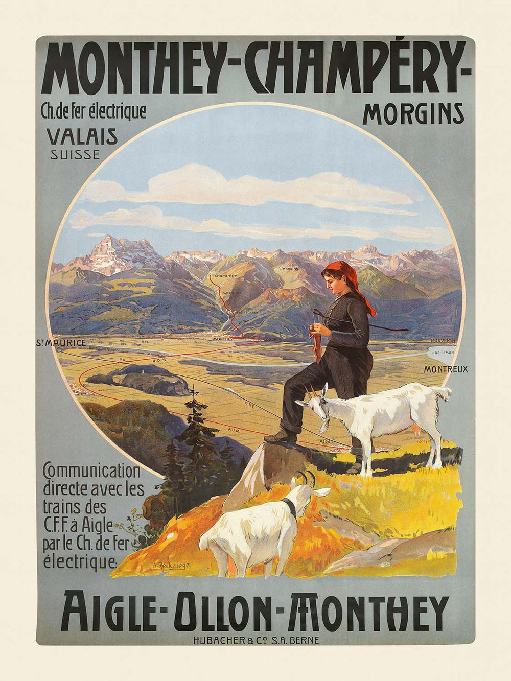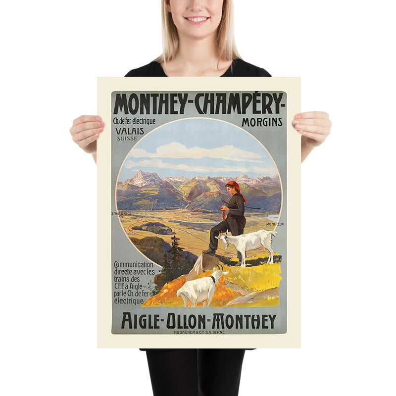 Monthey-Champéry. Aigle-Ollon-Monthey by Anton Reckziegel (1909) captures the romance of early Swiss travel at the moment railways were transforming alpine life. In this classic Art Nouveau–influenced poster, a pastoral shepherdess and her goats overlook a sweeping Chablais landscape framed within a bold circular vignette, while elegant lettering advertises the routes linking Aigle, Ollon, and Monthey to the high valley of Champéry. Created at the height of Switzerland’s tourism boom, the work balances decorative flourish with geographic clarity, inviting the viewer into a world of mountain air, winding rails, and luminous light.