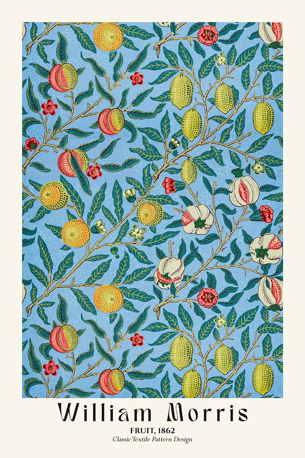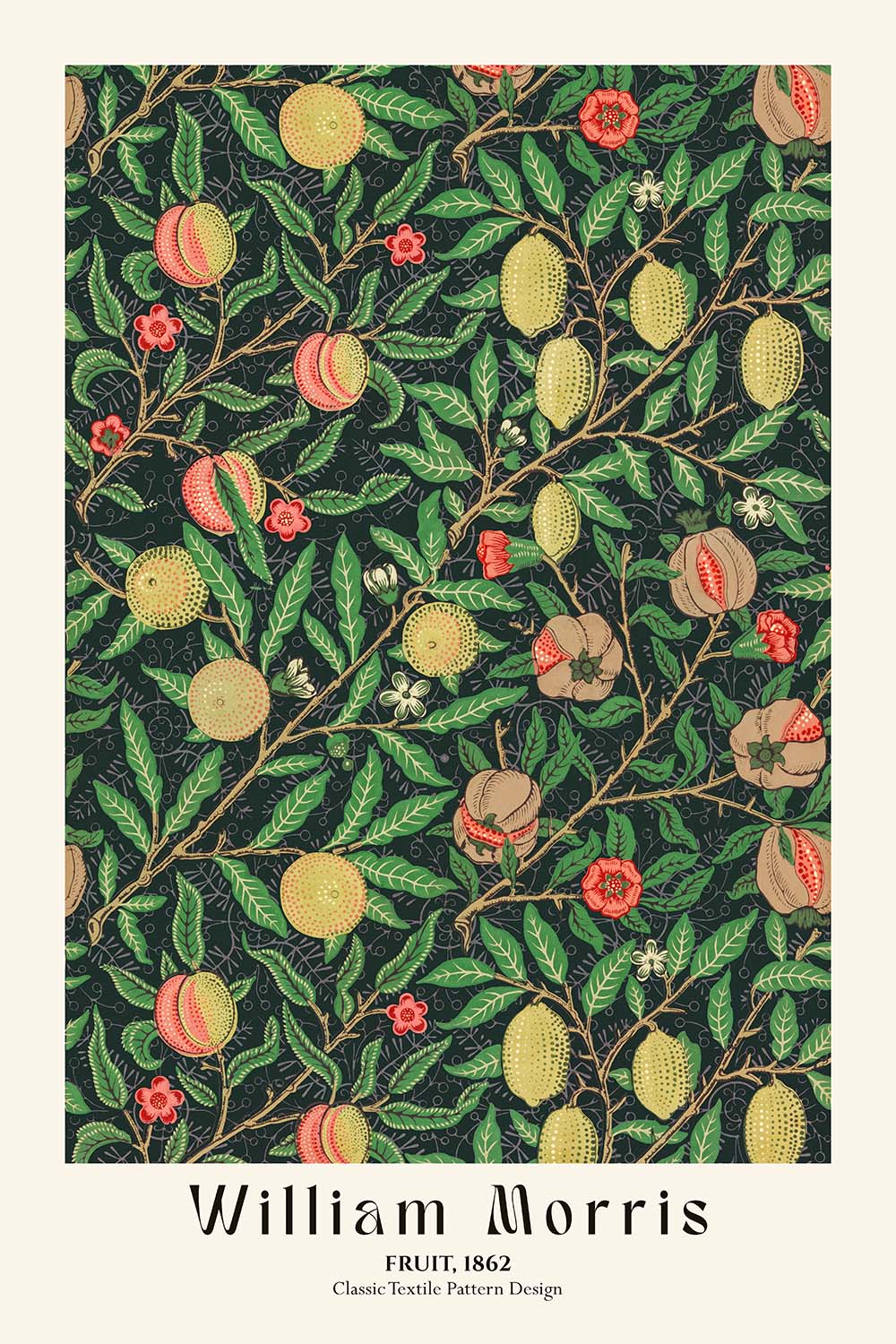 Fruit by William Morris (1862) is a defining pattern of the Arts & Crafts era—an elegant celebration of orchard abundance translated into rhythmic, hand-crafted ornament. This restored, high-quality print revives Morris’s richly detailed botanical forms, where twining branches, clusters of fruit, and crisp foliage interlace to form a serene, purposeful repeat. Conceived at the moment when Morris was reshaping British interiors with nature-driven design and honest craftsmanship, Fruit embodies his ideal that beauty should be both lived with and well made.
