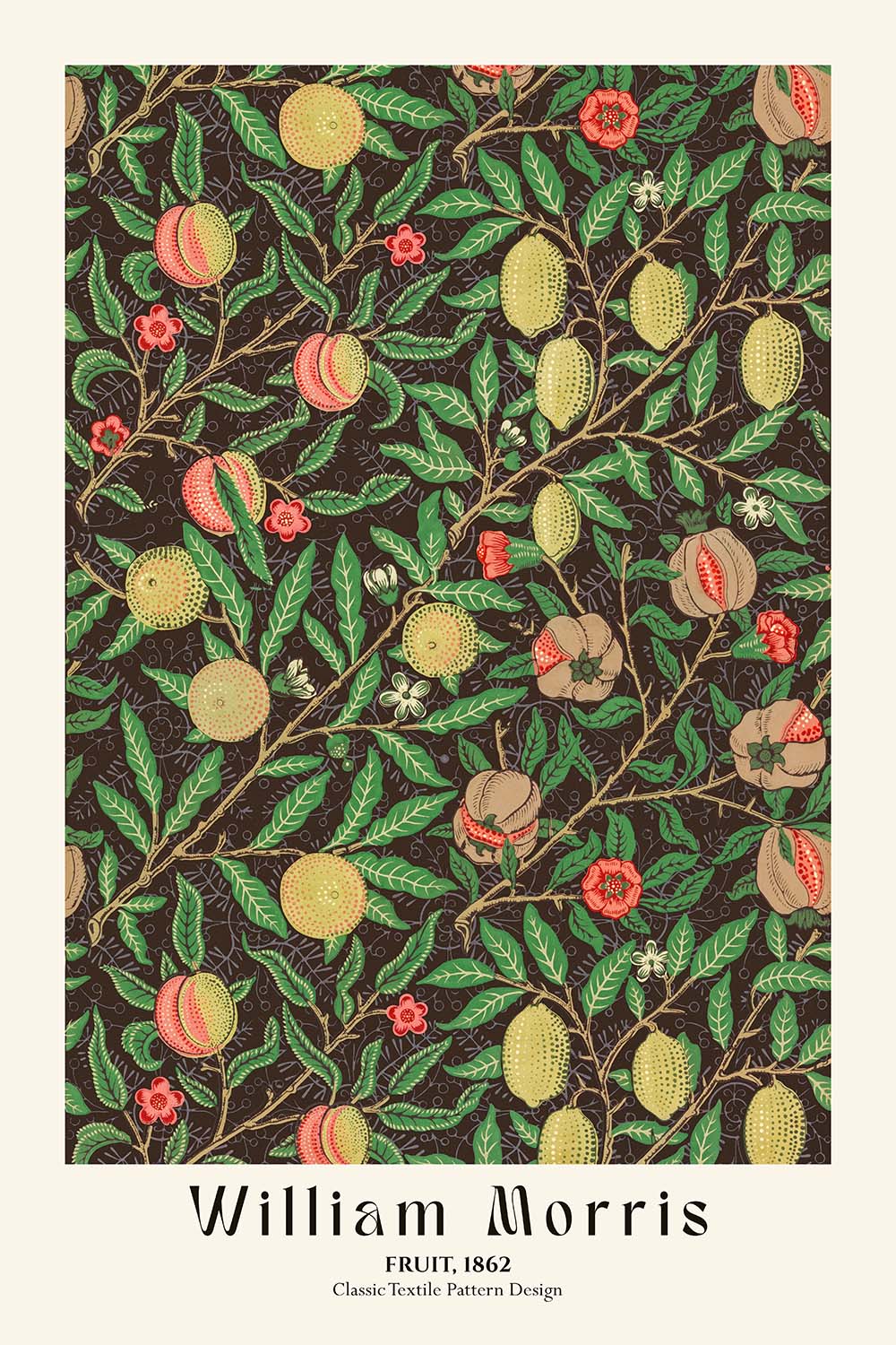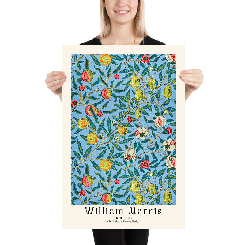 William Morris—designer, poet, publisher, and social thinker—founded Morris & Co. and spearheaded the Arts & Crafts movement, championing handcraft and the unity of art and everyday life. His wallpapers and textiles set a new standard for pattern design, marrying medieval inspiration and natural observation with superb technical discipline. Fruit stands among the motifs that helped define this vision: cultivated, humane, and endlessly livable.