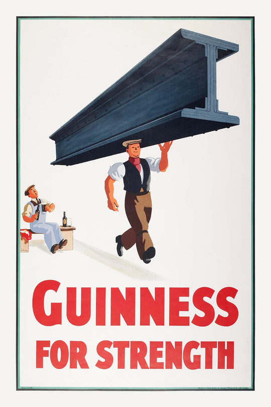 Step into the vibrant world of vintage advertising with "Guinness for Strength" by John Gilroy, a classic 1934 colour lithograph that captures the wit and charm of early 20th-century commercial art. Designed as a promotional poster for Guinness, this iconic image features a cheerful builder effortlessly carrying an enormous steel girder on his shoulder, embodying the slogan "Guinness for Strength." Gilroy’s delightful approach to advertising helped shape the visual identity of Guinness, making this piece a celebrated milestone in the history of marketing and graphic design.