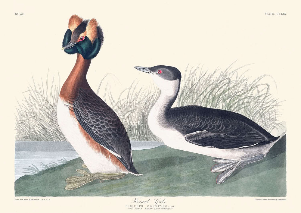 This artwork is particularly notable for its historical and ecological context. It vividly documents the migratory habits of the Horned Grebe along the waterways of the Western States, challenging misconceptions about their migration patterns. Audubon's illustration provides insight into the bird's seasonal behaviors and habitat preferences.
