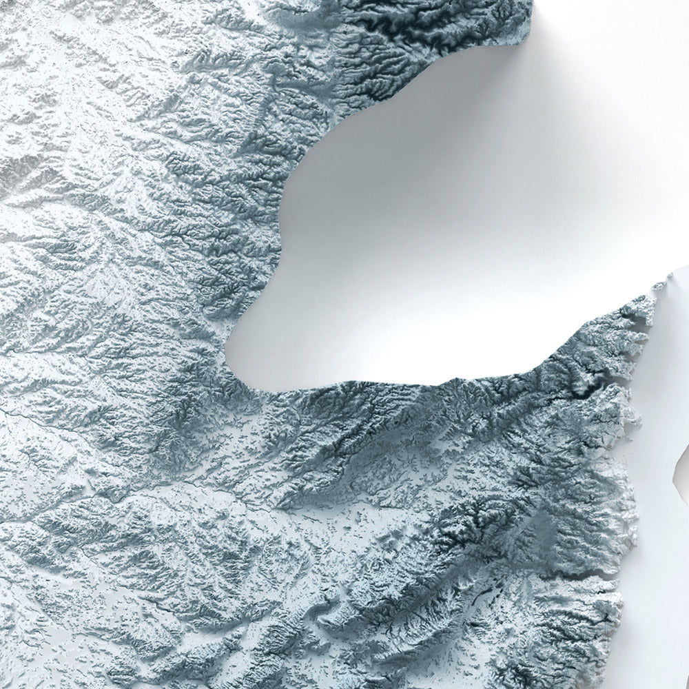 Our shaded relief prints use ultra high resolution topographic data and a secret 3D rendering process to create the illusion of raised terrain — like the mountains are about to lift right off the page. No labels, no borders, no distractions. Just the raw shape of the land, brought to life in a clean, modern style.