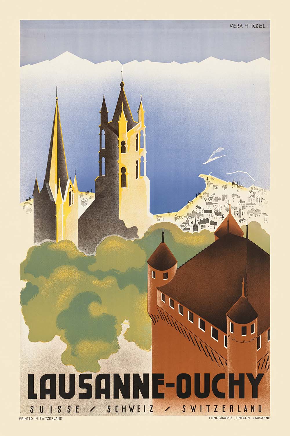 About the artist: Vera Hirzel was a Swiss graphic artist active in the early to mid–20th century, working in the vibrant poster culture that helped define European travel imagery between the wars. Her work reflects the clarity and confidence of the Art Deco movement—streamlined forms, purposeful geometry, and luminous color—paired with a sensitivity to place that made her tourism posters enduringly memorable.