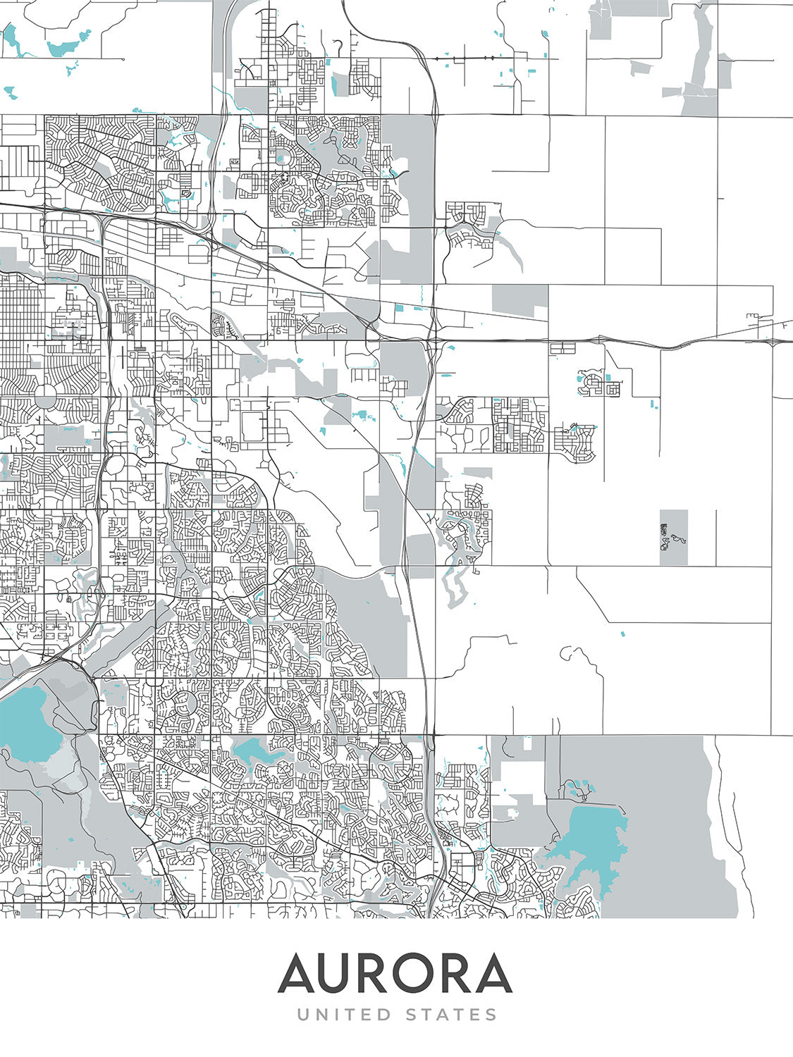 This map of Aurora, Colorado, is a modern, detailed street map without labels, perfect for adding a touch of contemporary style to your home décor. The map covers a generous area, encompassing a wide range of neighborhoods, major roads, and landmarks, all rendered in a visually striking and easy-to-read format.