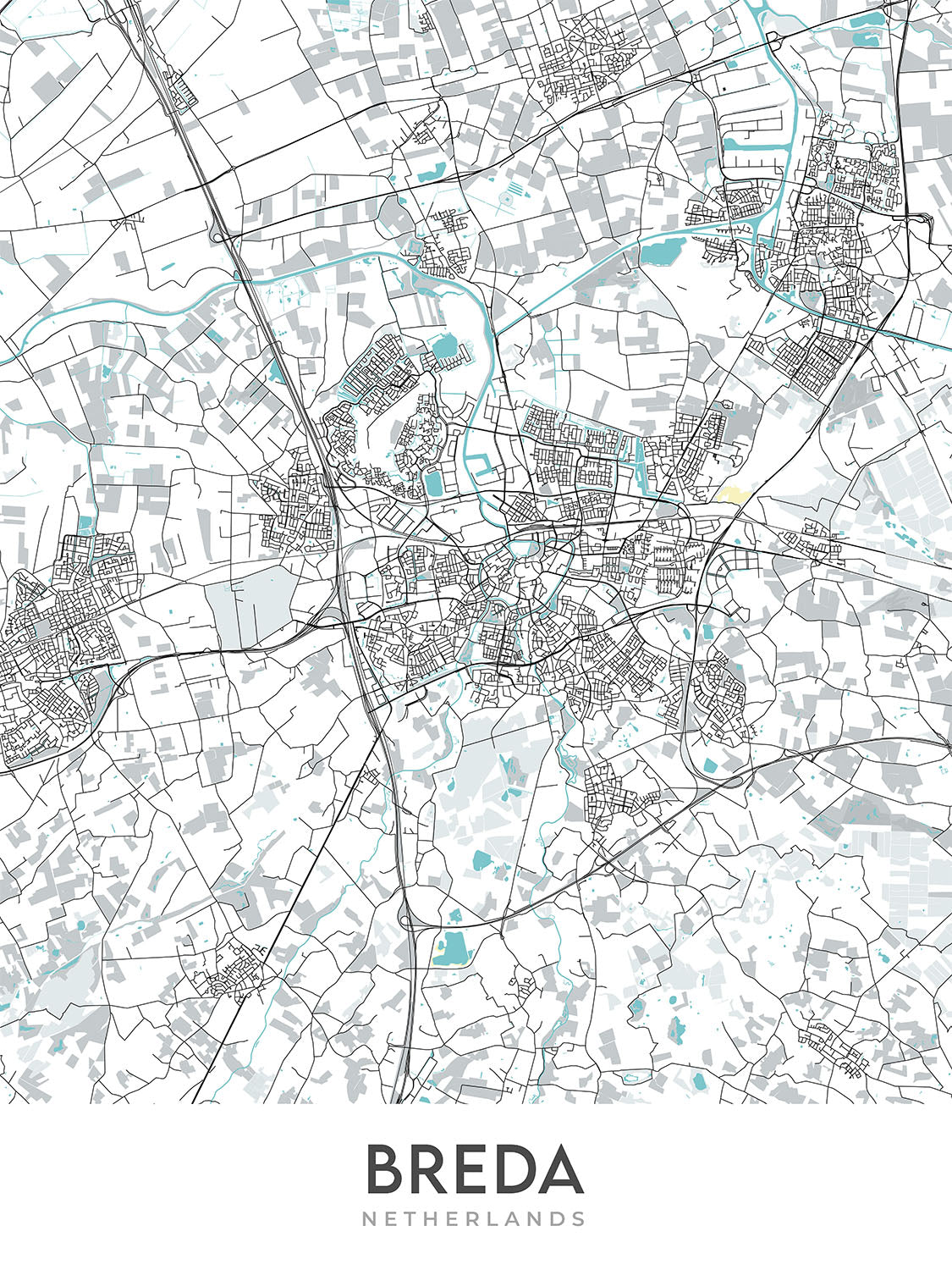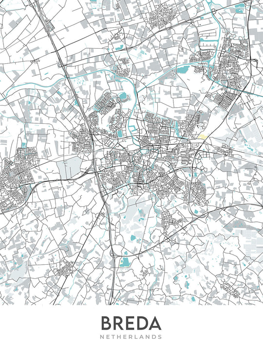 Modern City Map of Breda, Netherlands: Grote Kerk, Kasteel van Breda, Stedelijk Museum Breda, A16, A27