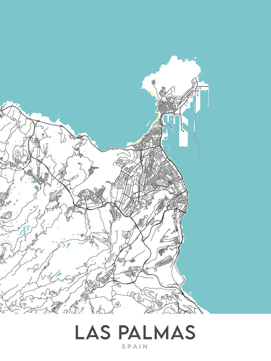 This map of Las Palmas, Spain, is a modern and detailed cartographic artwork that captures the essence of this vibrant city. The map focuses on the central area of Las Palmas, encompassing a diverse range of neighborhoods, from the historic Vegueta and Triana to the modern Ciudad Jardín and Guanarteme. It provides a comprehensive overview of the city's layout, making it an ideal piece for those interested in urban geography and design.