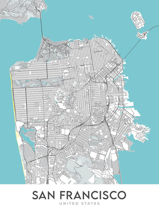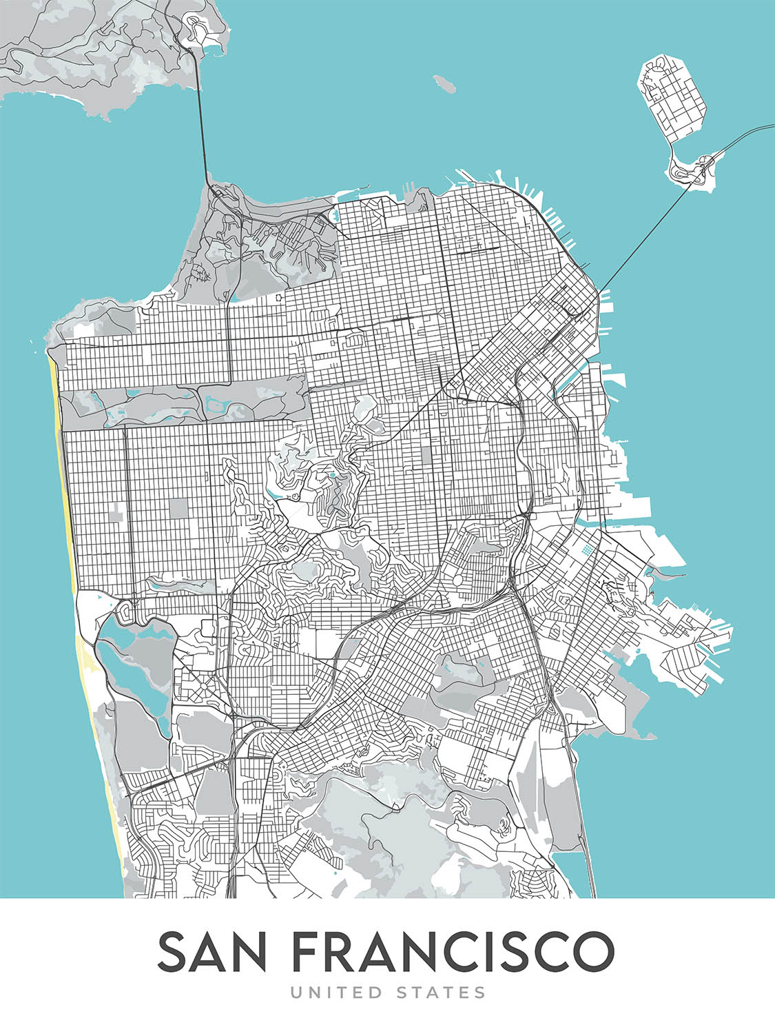 The Unique Maps Co. has created a truly unique and visually stunning map of San Francisco. Their modern design and use of a limited color palette create a sophisticated and contemporary feel, making this map a stylish addition to any home or office. The map's clean lines and uncluttered design allow the city's natural beauty and iconic landmarks to take center stage.