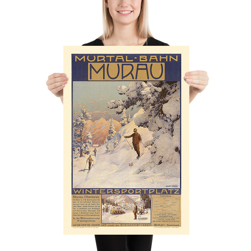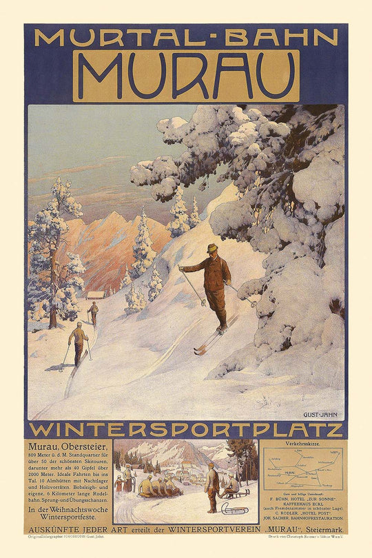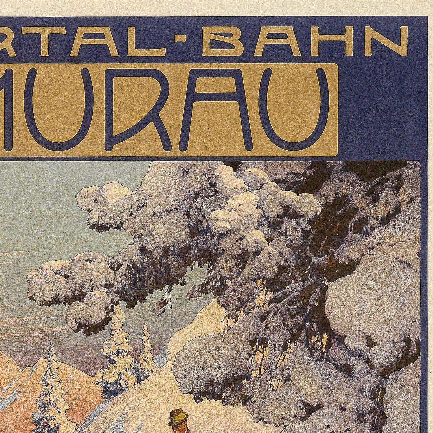 Murtal-Bahn by Gustav Jahn is a vintage Austrian travel poster celebrating the alpine beauty of the Mur Valley and the railway that opened it to winter adventure. Jahn, the celebrated Viennese landscape painter, poster artist, and mountaineer, brought firsthand experience of high mountains to his work. Trained at the Academy of Fine Arts and active with the Österreichischer Alpenklub, he became widely known for his striking series created for the Imperial Royal Austrian State Railways—posters that helped popularize skiing and alpine tourism across Austria.