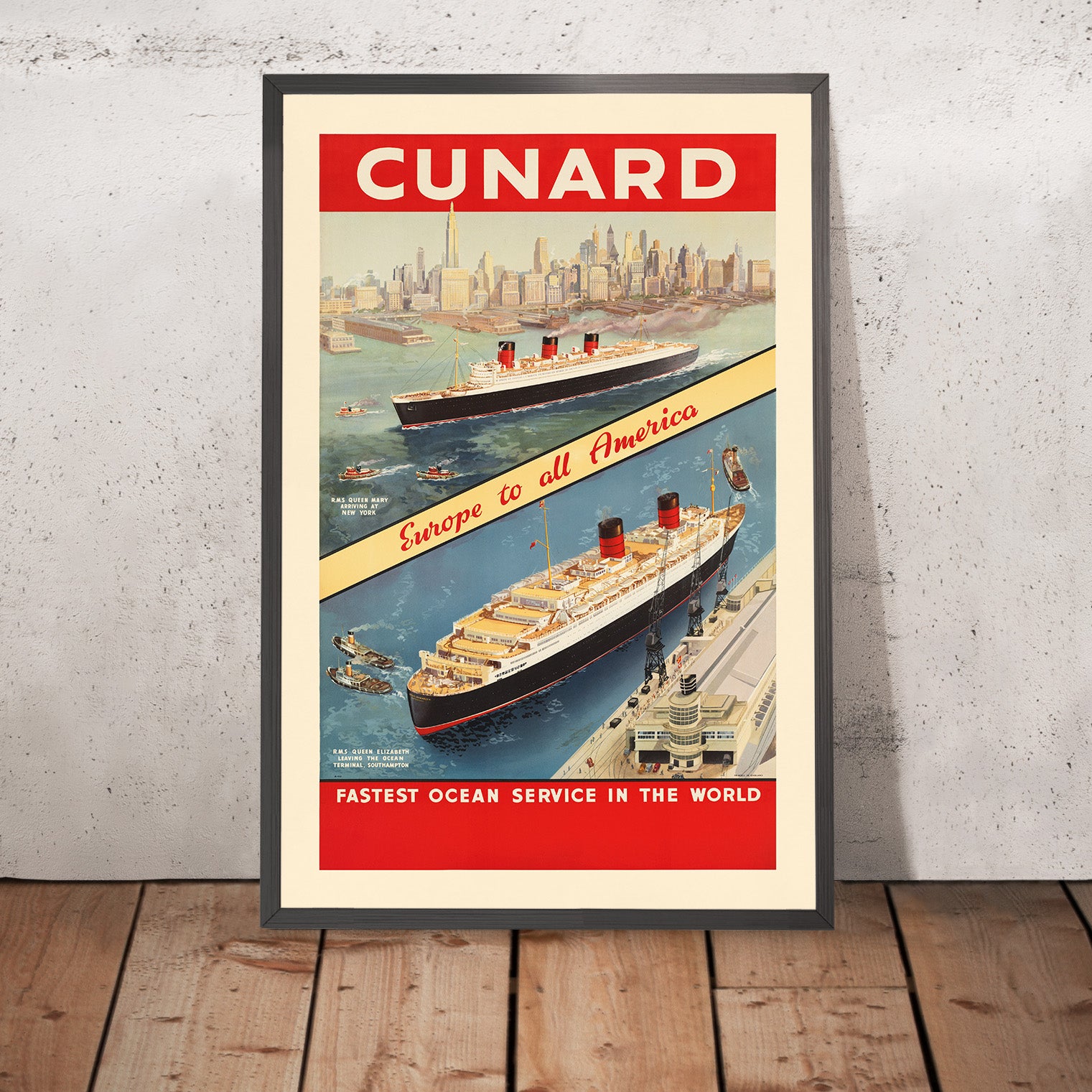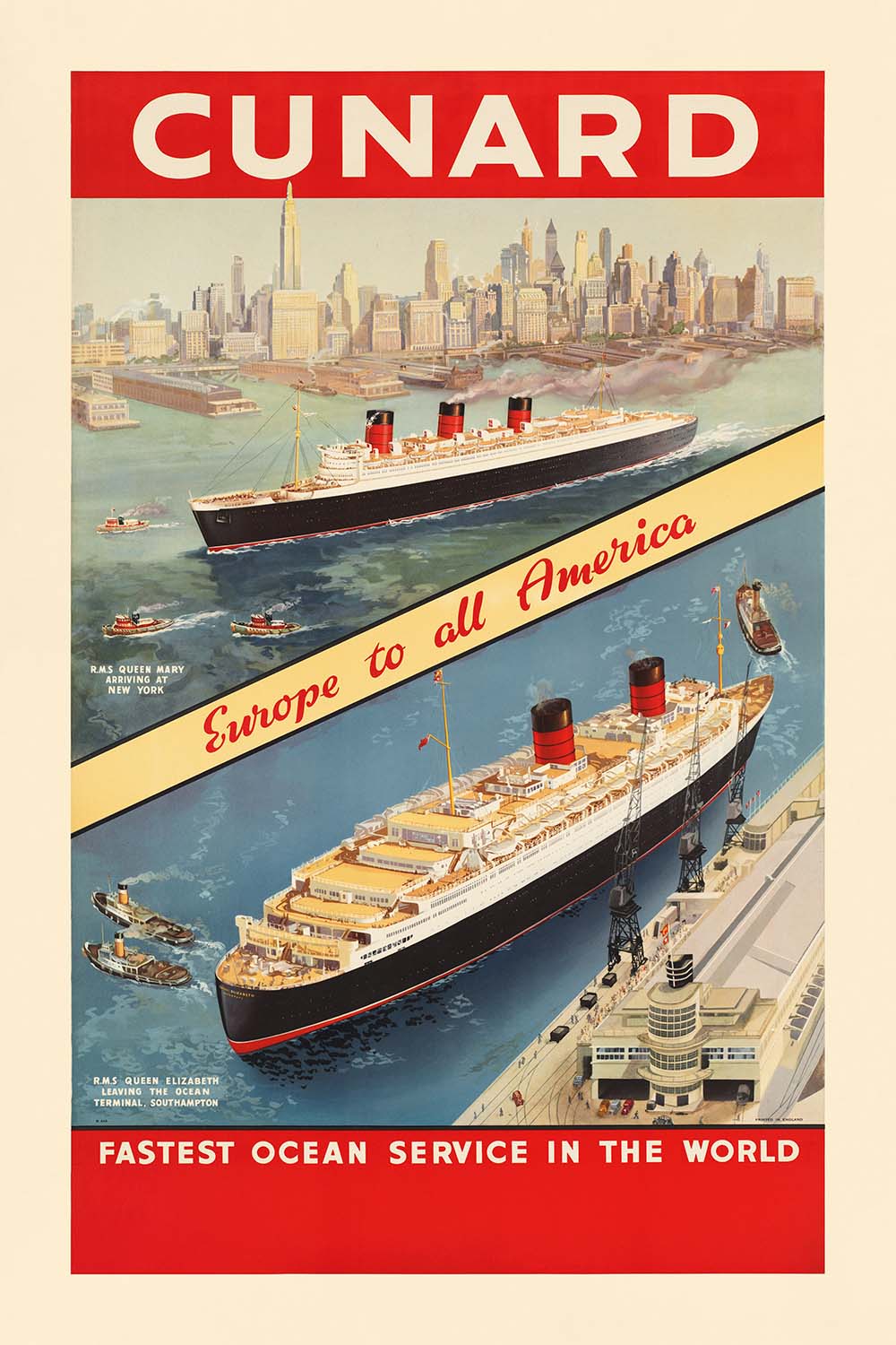 Cunard. Fastest ocean service in the world is a classic mid‑century travel poster created for the famed British shipping company’s transatlantic services. The original artist is unknown, but the work captures two celebrated liners in action: “R.M.S. Queen Mary arriving at New York” across the upper panel, and “R.M.S. Queen Elizabeth leaving the Ocean Terminal, Southampton” below—both captions appear on the poster. A cream diagonal ribbon reading “Europe to all America” slices dynamically across ocean blues, while a bold red header proclaims CUNARD and a matching footer declares the famous tagline. The composition’s crisp skyline of New York and the streamlined Southampton terminal anchor the romance of an Atlantic crossing at the height of ocean‑liner glamour.