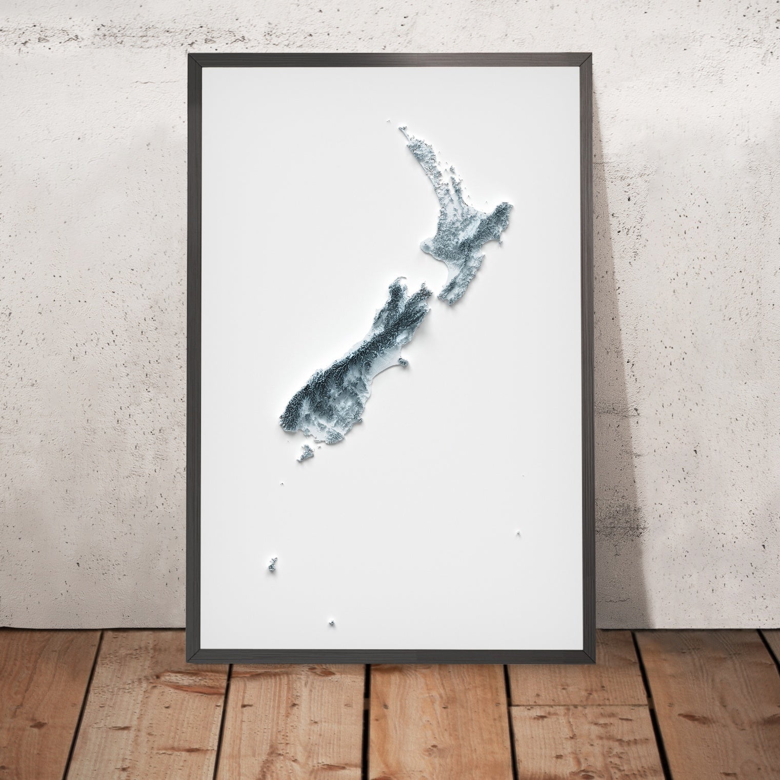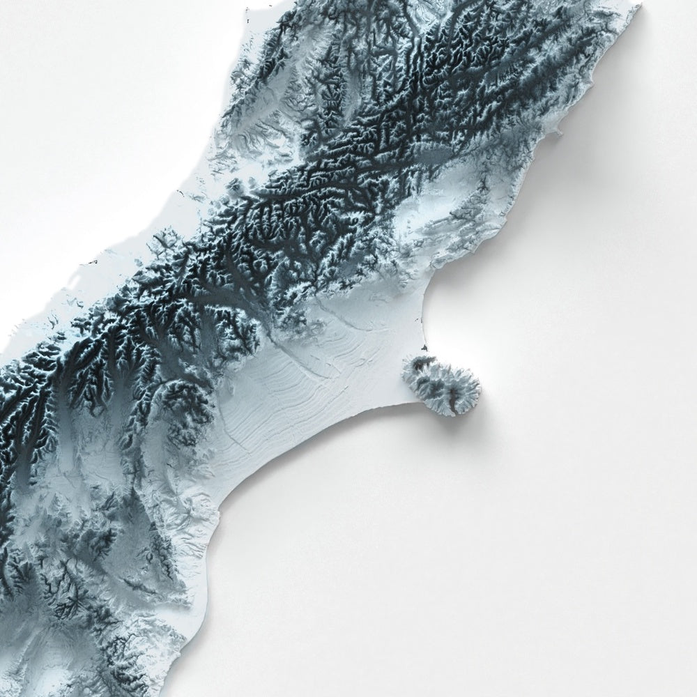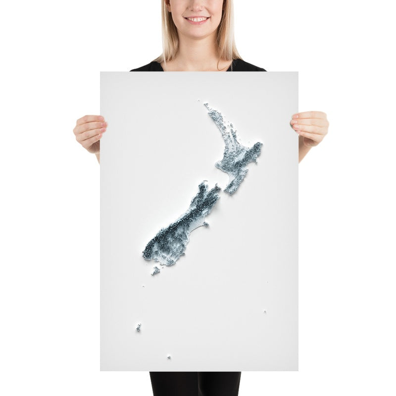 This is a minimalist topographic relief map of New Zealand, created by The Unique Maps Co. and finished with our trademarked Unique 3D process. There are no labels, no roads, and no towns — just the land itself, sculpted so that light and shadow bring out every summit, ridge, basin, and inlet. From a distance you see two islands poised across a narrow strait; up close you begin to recognize the drama of volcanoes, fjords, glaciers, and plains that make Aotearoa so distinctive.