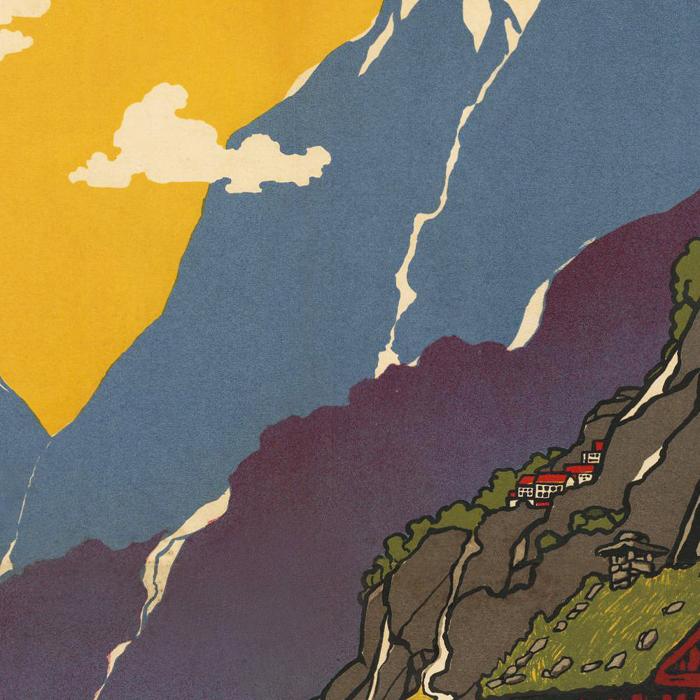 Noorsche Vacantiereizen by Albert Hemelman (1926) captures the romance of early European tourism with a boldly stylized view of Norway’s mountains, water, and clustered village rooftops. Designed in the high Art Deco idiom, Hemelman’s composition distills the drama of the Norwegian landscape into crisp geometry and luminous color, inviting Dutch holidaymakers of the 1920s to discover fjords, fresh air, and far horizons. Its Dutch title—meaning “Norwegian Vacation Travel”—speaks directly to the era’s growing appetite for leisure journeys north.