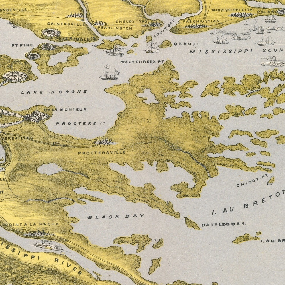 Military themes drive the narrative. At the mouth of the Mississippi, steamers and men-of-war illustrate the Union blockade tightening around the Confederacy’s greatest port, with Forts Jackson and St. Philip shown commanding the passage to New Orleans. Similar scenes dot Mobile Bay and the approaches to Pensacola, where coastal batteries and narrow channels underscore the peril of running the blockade. Farther east, Ship Island appears as a crucial offshore foothold—ideal for staging operations along the littoral. By mapping ships against shoals, bars, and bay mouths, Bachmann makes the logic of the Anaconda Plan legible: choke the Gulf gateways, sever exports, and starve interior armies. The result is both reportage and prognosis, a pictorial brief on how control of sea lanes could decide the fate of river cities hundreds of miles inland.
