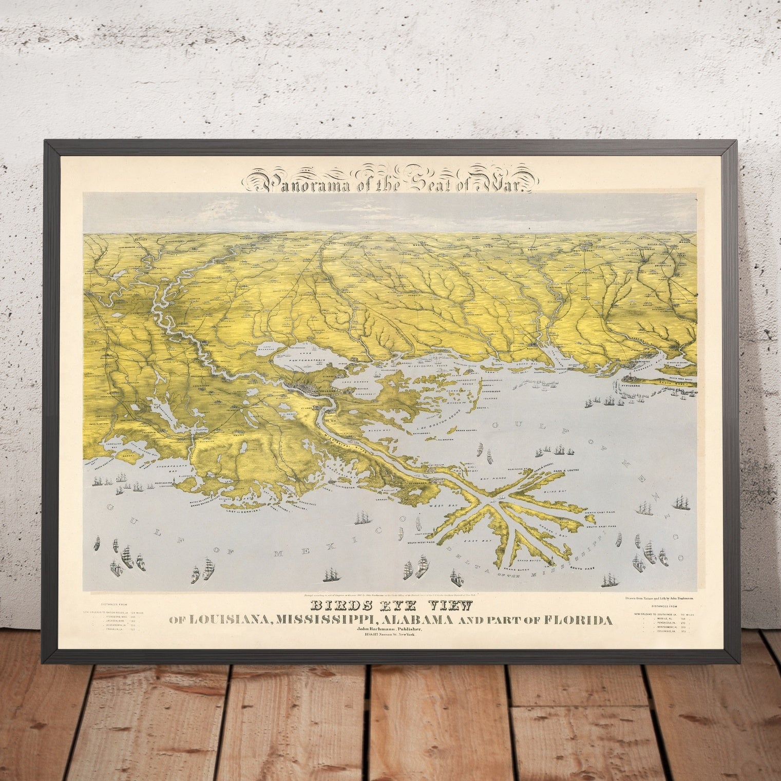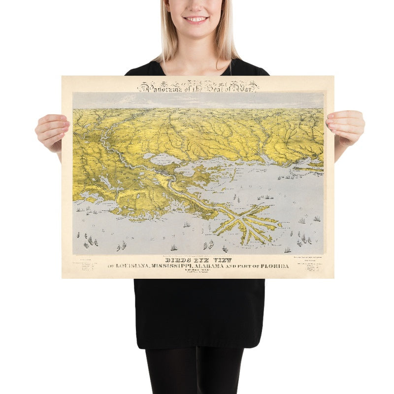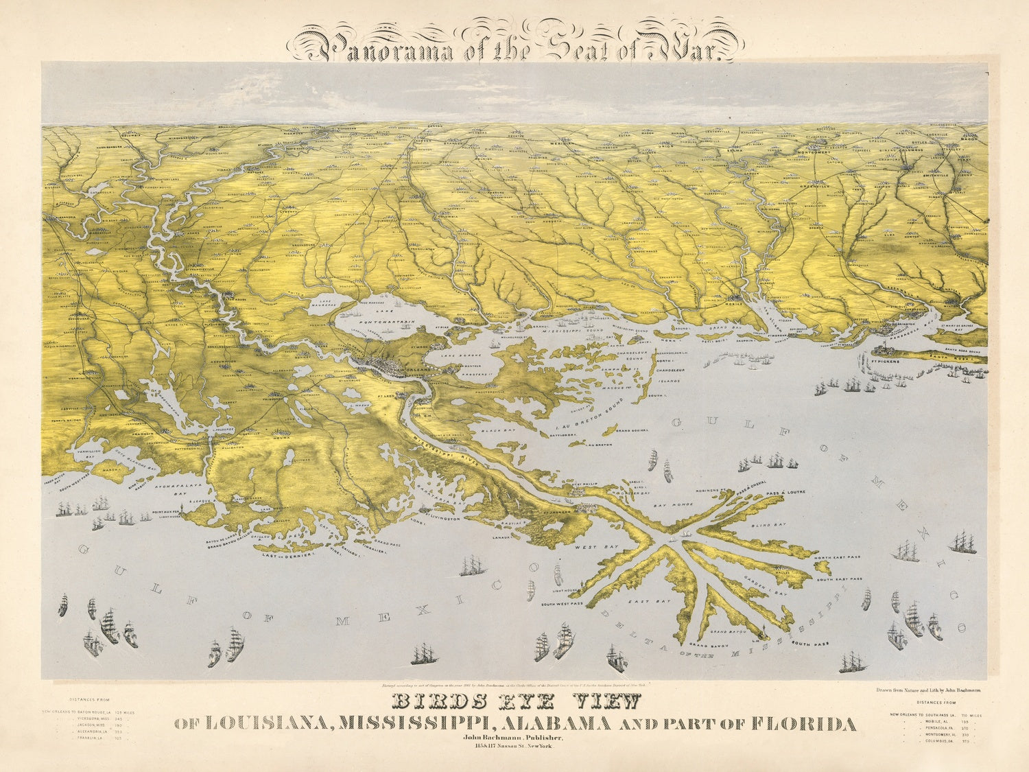 John Bachmann’s 1861 Panorama of the Seat of War: Bird’s-Eye View of Louisiana, Mississippi, Alabama and Part of Florida sweeps the eye from the Gulf of Mexico deep into the river-threaded South. Rendered in subtle wash color and staged from an elevated, oblique perspective, it fuses cartographic precision with theatrical depth, giving viewers an immediate sense of terrain, distance, and vulnerability. The composition gathers New Orleans, the Mississippi River Delta, Mobile Bay, Pensacola, and the Florida Panhandle into a single continuous theatre, while major interior cities—Vicksburg, Jackson, Selma, Montgomery, and Natchez—anchor the inland horizon. Issued in the first year of the Civil War, it belongs to Bachmann’s celebrated series that translated breaking events into vivid panoramas for Northern audiences, transforming abstract dispatches into graspable geography and anticipating the campaigns that would soon convulse these shores and waterways.