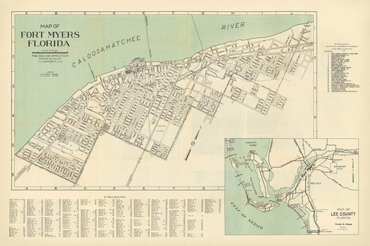 The "Map of Fort Myers Florida," crafted in 1945 by the esteemed Frank B. Dolph, offers a captivating window into the city’s postwar landscape. Issued by the Lee County Chamber of Commerce, this city street map captures Fort Myers at a transformative moment, just as it was emerging from its small-town roots into a vibrant Florida destination. With the Caloosahatchee River elegantly bordering the city, Dolph’s map showcases the vital arteries and civic heart of Fort Myers, providing a rare, detailed glimpse into its mid-20th-century layout.