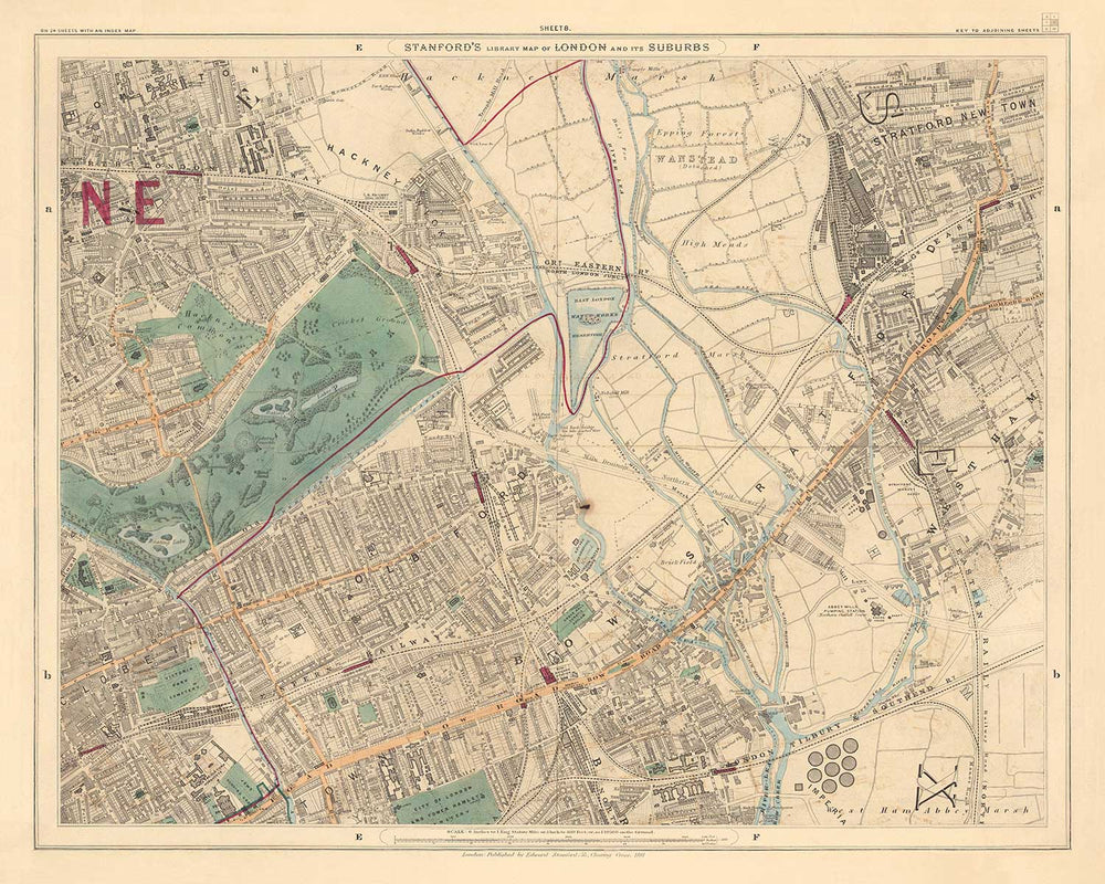 The map was originally published in 24 sheets. Altogether the map would've measured about 2 metres wide (78 inches). This here is sheet 8, which focuses on the eastern London boroughs of Hackney and Tower Hamlets.