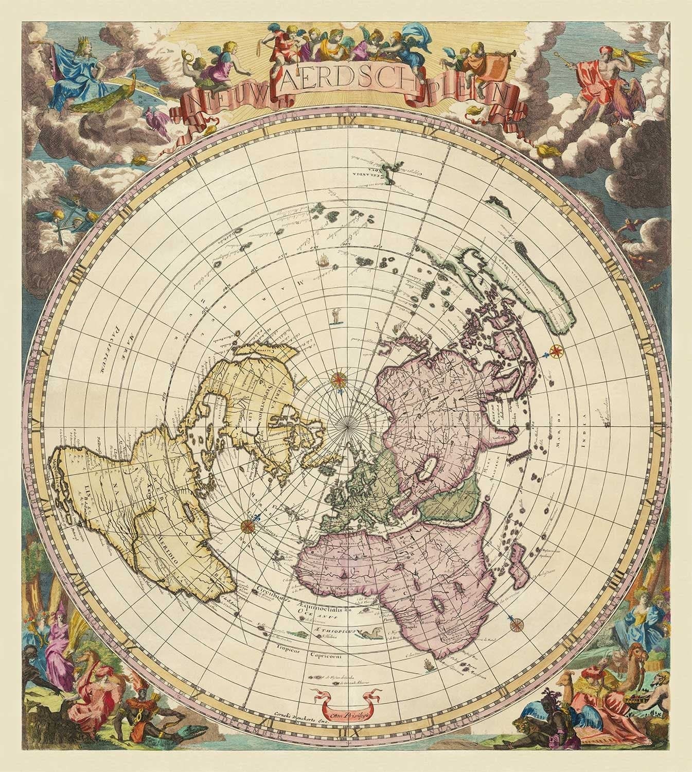 This projection is technically called a 'polar azimuthal' projection, which means that the Earth has been flattened with the North Pole at the top. If you look at the listing images, you can see that our understanding of the world was quite different at the end of the 17th century: Australia had not been fully discovered, Antarctica had not been discovered at all, and California was still an island...