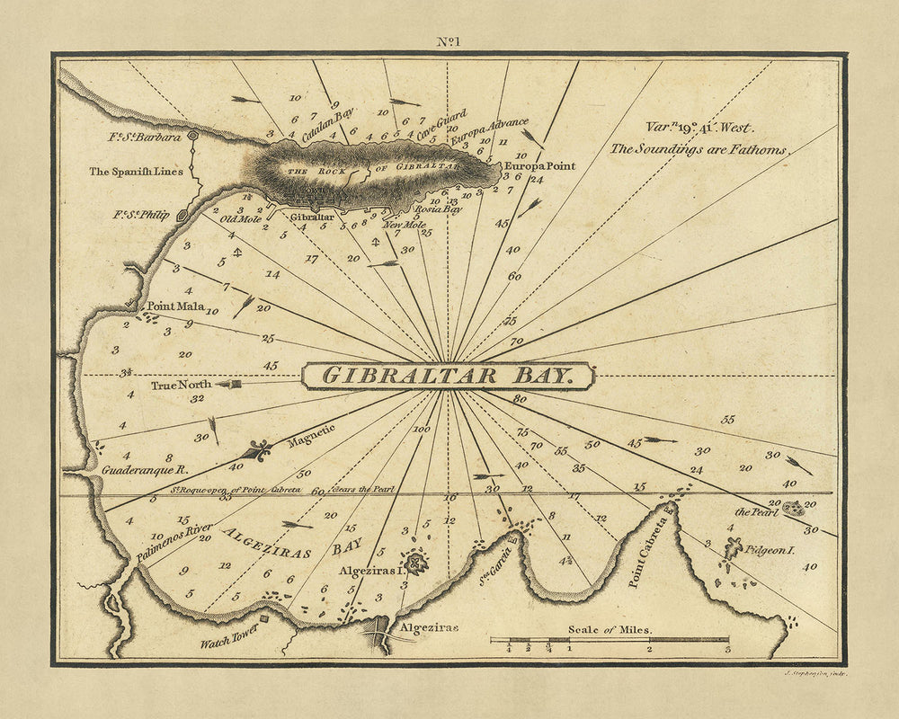 A Chart of Gibraltar Bay, including Algeziras Bay, and the Pearl Rock is an exquisite example of early 19th-century cartography, a period marked by significant naval power and geopolitical changes. Crafted in 1802 by the renowned British cartographer William Heather, this chart is not merely a navigational tool but a piece of history, capturing the strategic importance of Gibraltar during the Napoleonic Wars. Heather, known for his detailed and precise maritime charts, presents a comprehensive view of this critical Mediterranean point where the Atlantic meets the European and African continents.