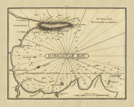 In addition to its practical maritime details, the chart also offers a glimpse into the terrestrial landscape, depicting some topographical features such as the rugged terrain of the Rock of Gibraltar. This blend of land and sea information provides a holistic view of the region's geography, making it an invaluable resource for understanding historical naval strategies and the natural challenges faced by mariners of the time.