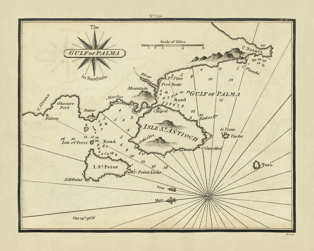 Old Gulf of Palma Nautical Chart by Heather, 1802: Sardinia, Sant' Antioco, Isola di San Pietro