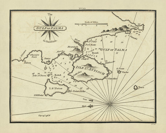 As a piece of cartographic history, "The Gulf of Palma in Sardinia" stands out as a testament to the skill and meticulous efforts of William Heather. His work not only guided the mariners of his time but continues to intrigue and inform those interested in the art of navigation and cartography. The map’s rarity and historical importance make it an invaluable collectible for enthusiasts and scholars alike, offering a unique perspective on Mediterranean maritime history.
